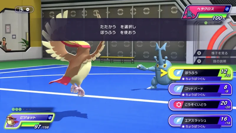 「ばつぐん」「ちょうばつぐん」といった表示や、わざの効果の明確化など、バトルに必要な情報が整理されている点も印象に残る。実際にプレイしていても判断に迷う場面が減り、そのぶん読み合いや立ち回りに意識を向けやすい。テンポよく試行錯誤を重ねられる設計は、本作の遊びやすさに直結していると感じた。