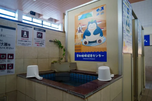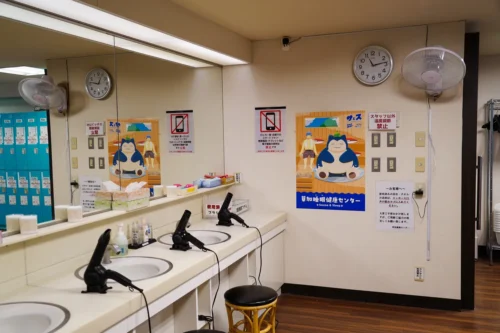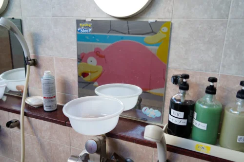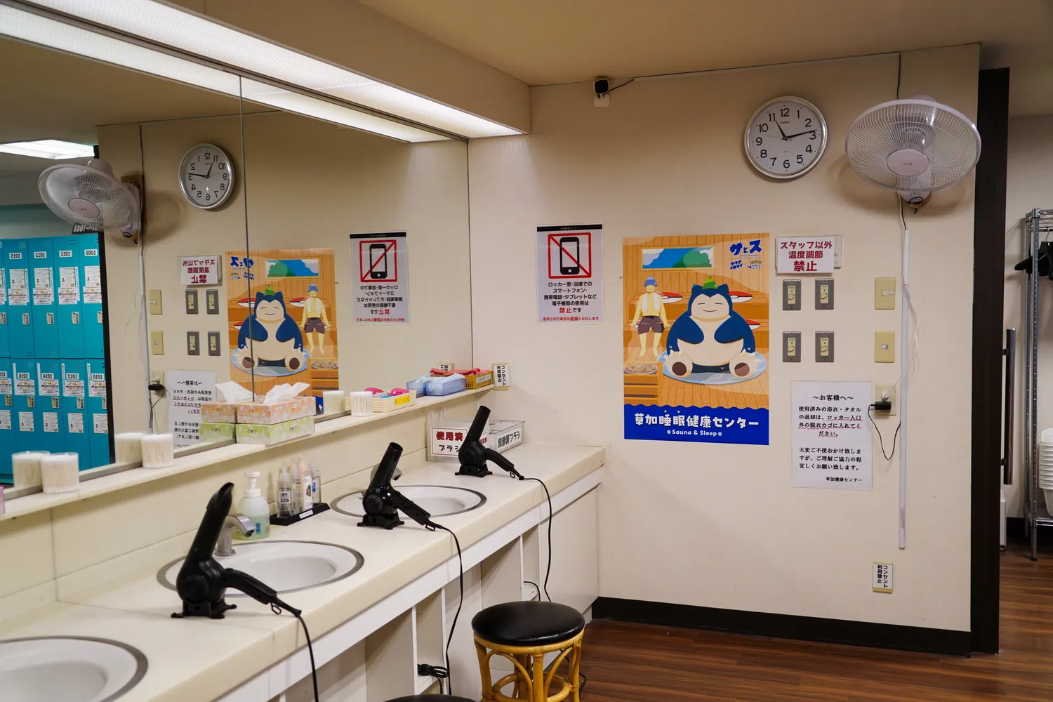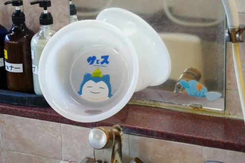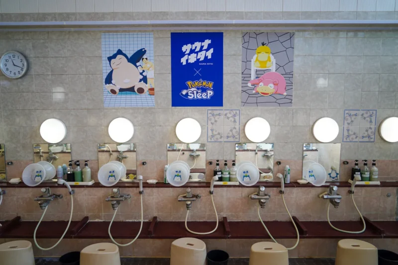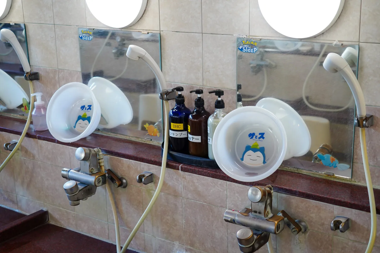 洗い場の鏡面にはポケモンたちの寝顔のシールが貼られているほか、カビゴンが描かれたオリジナルデザインの風呂桶も用意されており、施設利用と併せてコラボ要素を体験できる。鏡を見るたびにポケモンたちの寝顔が視界の端に見え、ファンにはたまらない内容となっている。