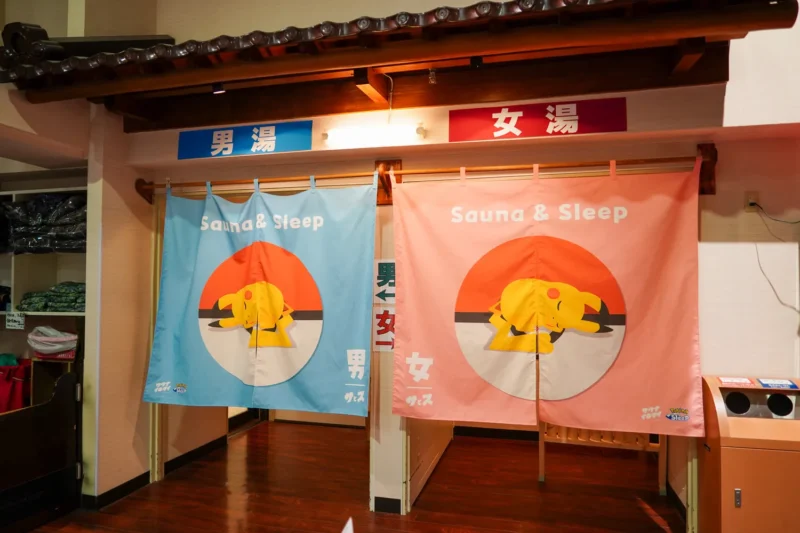 男湯・女湯前には歩行導線に合わせてピカチュウデザインの暖簾が設置され、来館者を出迎えてくれる。それぞれオス・メスのピカチュウの可愛い寝顔が描かれており、お風呂に入る前から楽しい気持ちになれるはず。