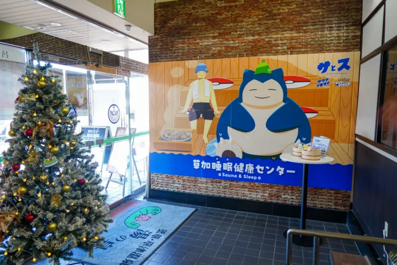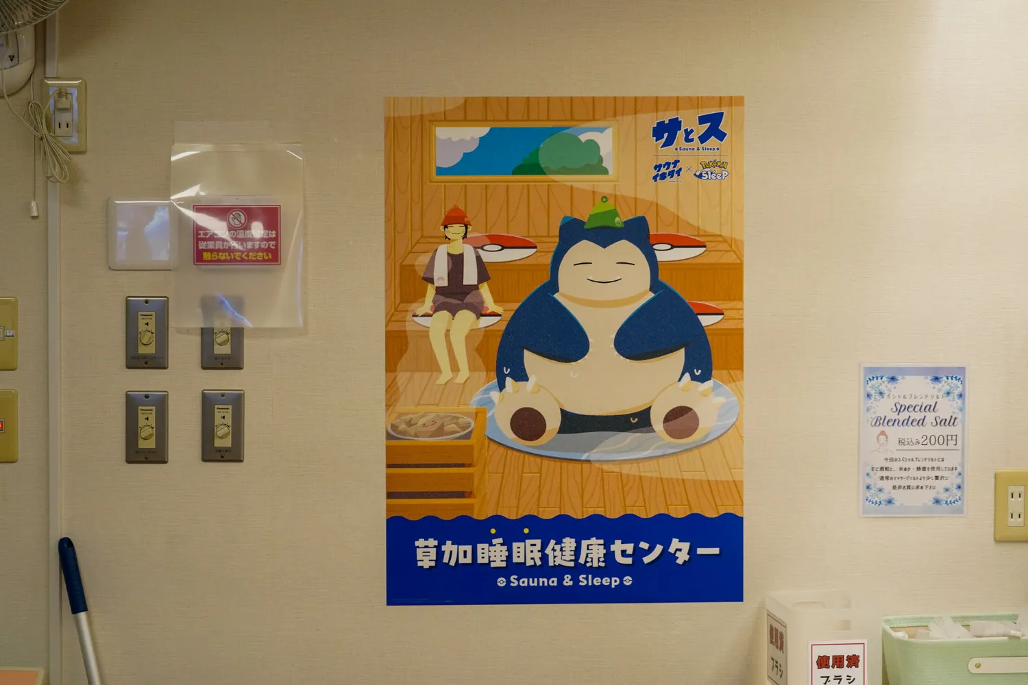「湯乃泉 草加健康センター」の入り口では、サウナを楽しむカビゴンと男性が描かれた「サとス」プロジェクトのキービジュアルが来場者たちを出迎える。サイズも大きく、記念撮影にオススメだ。