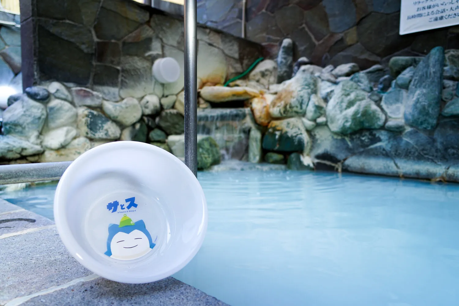 ちなみに、水風呂や露天風呂周辺に置いてある風呂桶もしっかりとカビゴン仕様になっている。