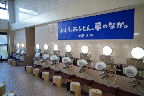 浴場・洗い場エリア:ポスターや鏡面シールで展開