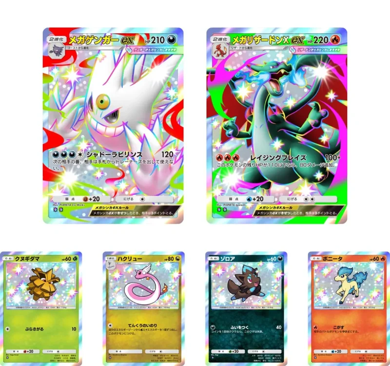 公開されたカードの一部には、メガリザードンXexやメガゲンガーexのほか、クヌギダマ、ハクリュー、ゾロア、ポニータといったポケモンの色ちがいバージョンが含まれている。