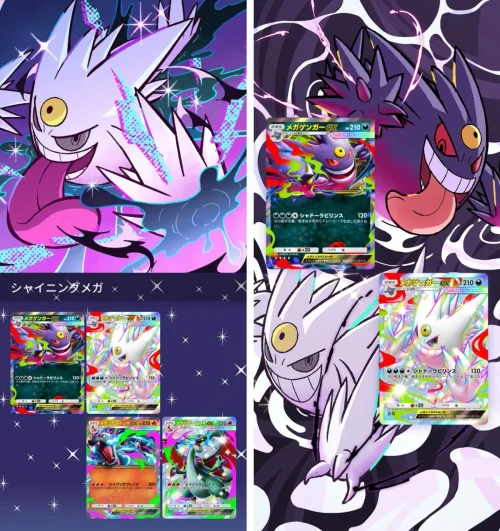 新たにラインナップに加わる拡張パック「シャイニングメガ」の目玉は、メガゲンガーやメガリザードンXをはじめとする、メガシンカしたすがたの「色ちがいのポケモン」だ。