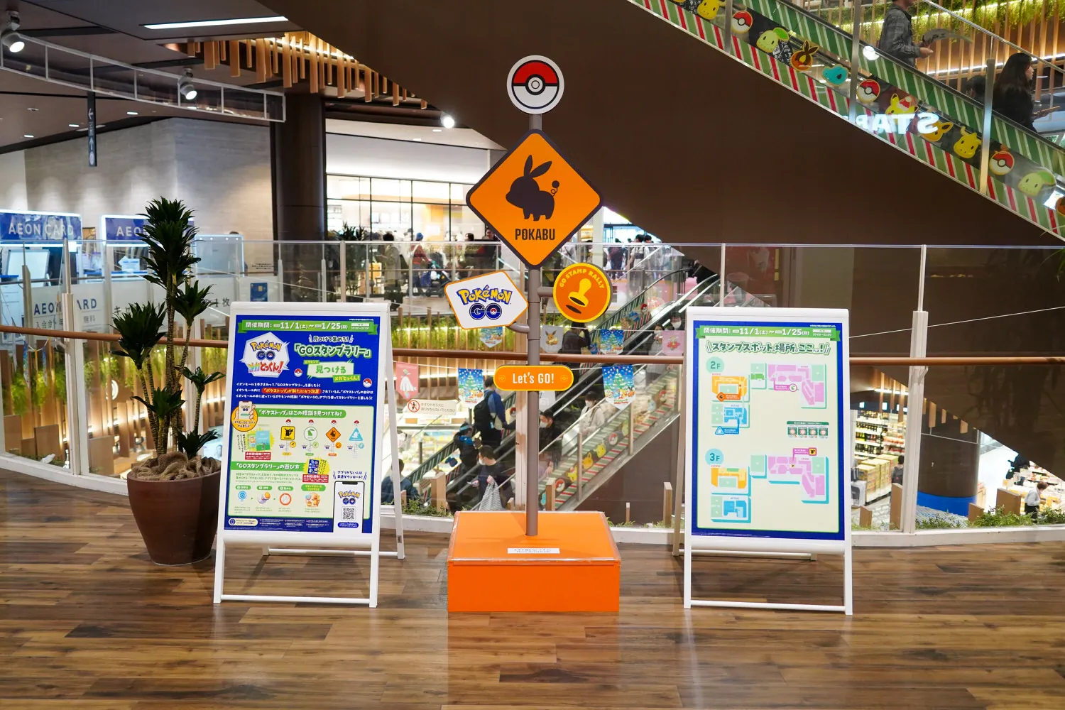 ポケストップはエキマエモールだけでなく、グランドモールやアクティブモールにも設置されている。ポケストップはゲーム上に表示されているだけでなく、館内に案内板のようにリアルで設置されているため、目視でも見つけることが可能だ。