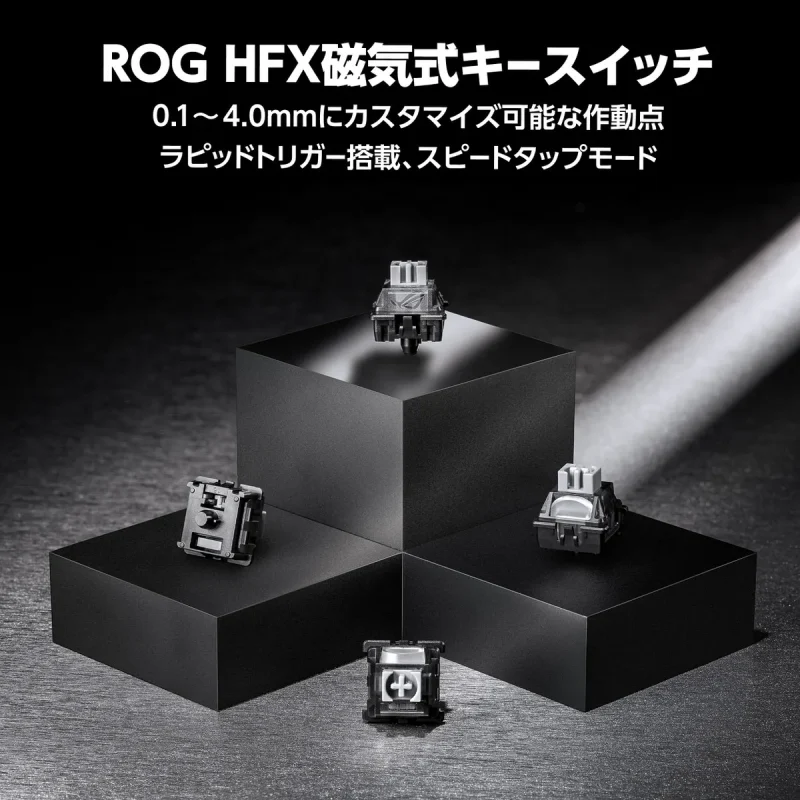 最大の特徴は、ROGが独自に開発したROG HFX Magnetic Switch(磁気スイッチ)を採用している点だ。磁気検知式のため物理的な接点がなく、摩耗が少なく応答精度が高い。ルブ済み構造によりスムーズな打鍵感を実現し、1億回の打鍵に耐える耐久性を備える。