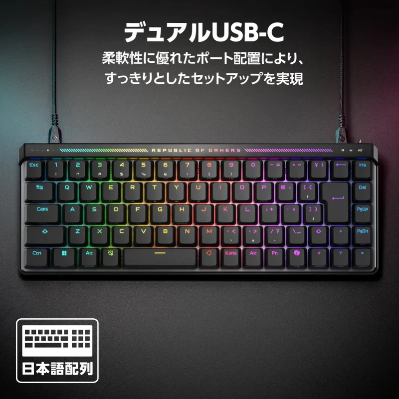 接続面では、左右に配置された2基のUSB Type-Cポートを備える。最大2台のPCに同時接続してワンタッチで切り替えられるため、デスク配置の自由度を高めるだけでなく、ストリーマーやマルチデバイス環境にも対応する。 全キー(Fn、Caps Lock、Windows、左Altを除く)はマクロ設定に対応し、RGBライティングはAura Syncで制御可能。Nキーロールオーバーにも対応する。