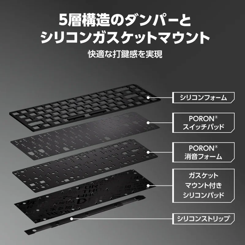 Falchion Ace HFXは、速度だけでなく快適な操作性にも重点を置いている。 内部には5層構造の防振・消音フォームを内蔵。2層のPORONフォームと3層のシリコン層を組み合わせることで、打鍵時のノイズや振動を抑え、柔らかく安定した打鍵感を実現した。 ガスケットマウント構造を採用することで、キー押下時の“沈み込み”を均一化し、長時間のプレイでも疲れにくい設計となっている。