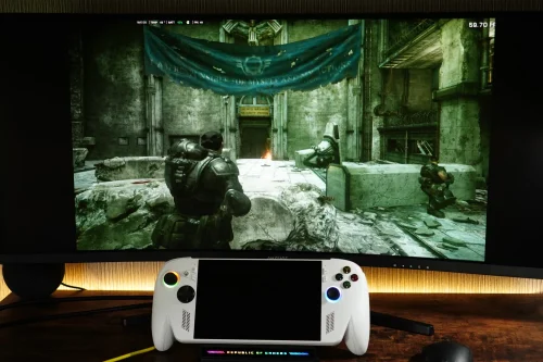 純正アクセサリのROG Bulwark Dock DG300を使って外部ディスプレイに映像出力をしたときにはどうなるのか。『Gears of War: Reloaded』を1080pで出力してみたところ、処理が軽い場面では55〜60fpsで動作することもあったが、激しい銃撃戦など処理の重い場面では20〜30fpsに落ちることもあった。