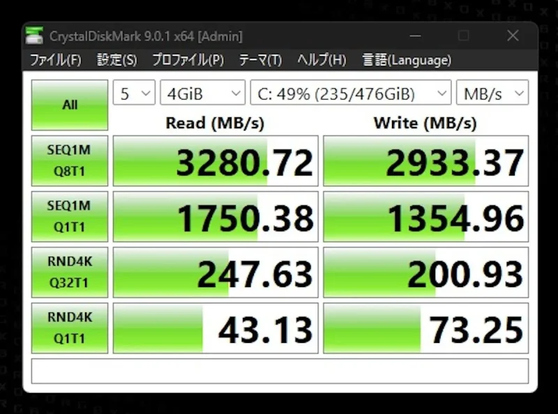 SSDの性能については、CrystalDiskMarkで計測してみたところ、上位モデルのXbox Ally Xよりは低い数値が出たものの、かなり高速で読み書きできている。ハンドヘルドとしてはかなり優秀だ。ちなみにSSDの換装も可能だが、メーカーのサポート対象外になるため、やる場合は自己責任で。