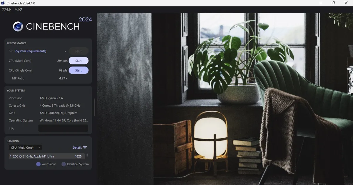 どれほどの性能になっているのか、電源に接続してターボモードにした状態で、Cinebench 2024でベンチマークスコアを計測してみた。