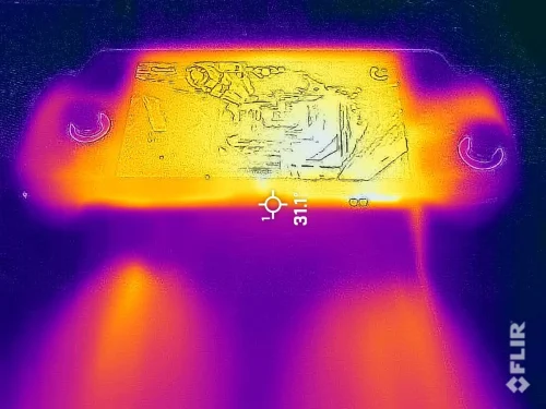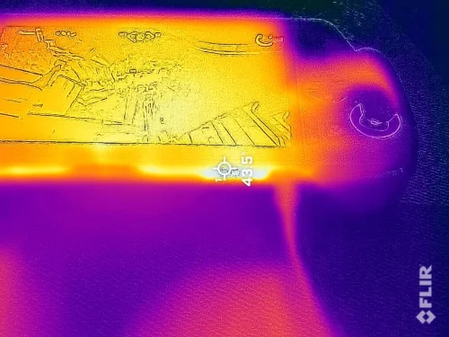 そして、気になる発熱についてだが、長くプレイするほど本体内部でそれなりに熱が発生しているのか、排気口付近から温風が出ているのが確認できる。最も熱い部分(左前方)は43.5℃に達していた。