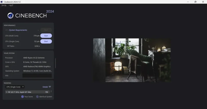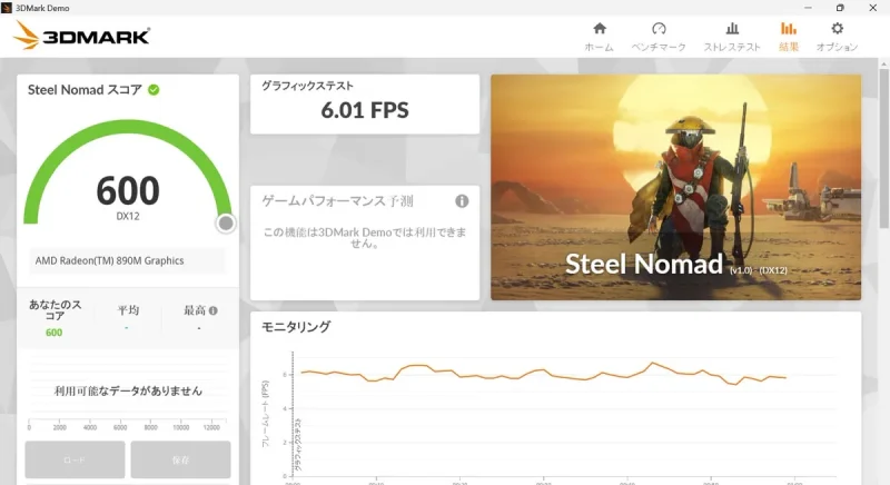 結果は上記のとおりで、「Cinebench 2024」ではシングルコアスコアが112、マルチコアスコアが779。「3DMark」ではSteel Nomadテストでスコア600を記録した。