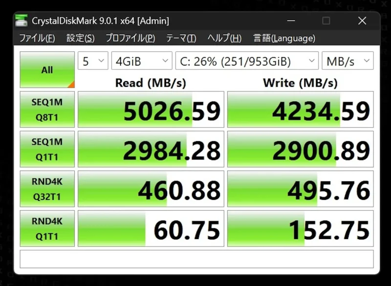 SSDの性能をCrystalDiskMarkで測定したところ、非常に高速な読み書き速度を確認できた。ハンドヘルドとしてはトップクラスのストレージ性能と言えるだろう。