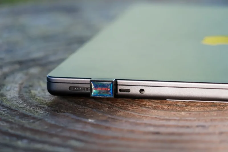 ポートに挿すときの上下は「SANDISK」の文字の向きで判別できる。逆向きにつけるとラップトップがガタつくのですぐに分かるはずだ。