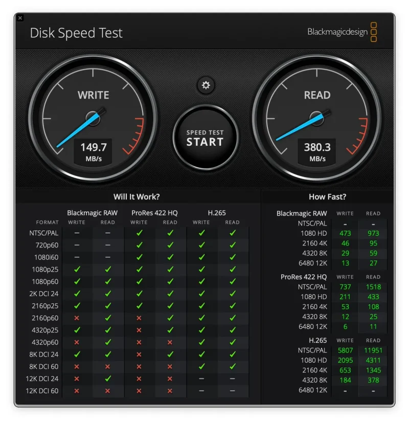実際にMacBook ProのThunderbolt 4(USB-C)ポートに接続し、Blackmagic Disk Speed Testで計測したところ、読み出しは380.3MB/sと公称値に近い結果に。一方、書き込みは149.7MB/sとやや控えめな数値となった。