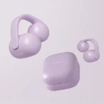 公開されたビジュアルは全体的にぼかされているが、人物の耳元には紫色のイヤホンのような製品が確認できる。色のラインを追っていくと、耳から後頭部にかけて回り込むように装着されているようにも見える。