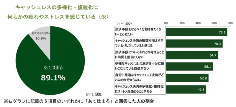 JR東日本がteppayの提供に踏み切った背景には、現在のキャッシュレス決済市場が抱える問題点がある。同社が行った調査によると、多くの生活者がキャッシュレス決済の多様化・複雑化に対して何らかのストレスを感じており、一都三県に住む生活者の約9割がこれに「疲れやストレスを感じている」という結果が出ている。