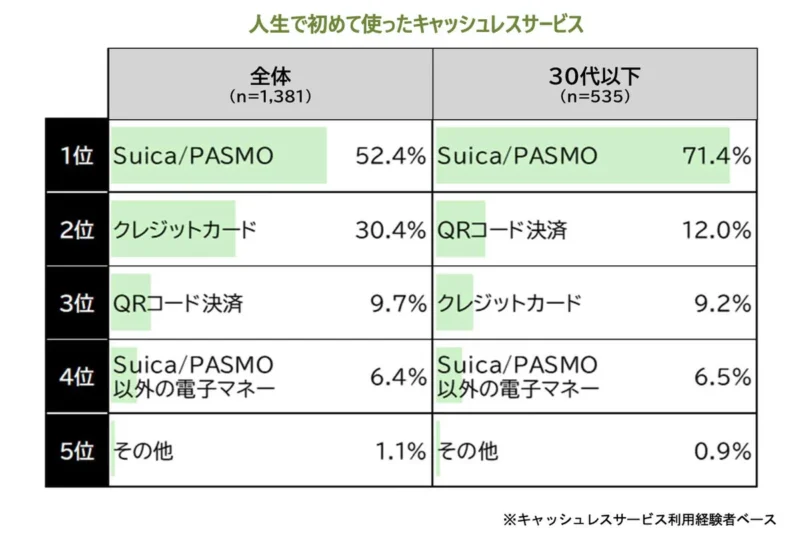 ここで、SuicaとPASMOのブランド力が活きてくる。SuicaとPASMOは一都三県での所有率が84.3%と非常に高く、キャッシュレス利用経験者が人生で初めて利用したサービスとして5割を超えてトップとなっている。