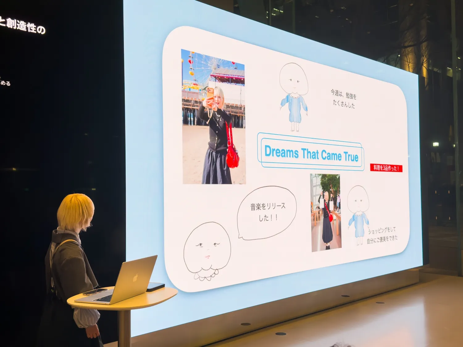 最後には発表の時間も設けられ、のえのんさんが会場を回って印象に残った作品を紹介。「ありがとう100人」や「フルマラソン完走」「海外留学」など、多彩な目標が並び、AIで生成した“目標を達成した自分”の姿が会場のスクリーンに映し出された。