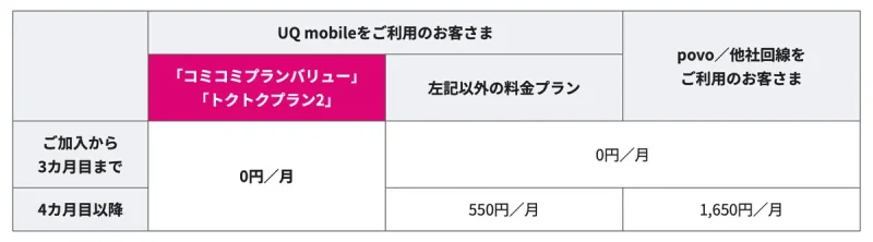 対象の2プラン以外のUQ mobileユーザーについては、加入から3カ月間は無料だが、4カ月目以降は月額550円となる。また、povoや他社回線のユーザー向けに提供されている「au Starlink Direct専用プラン+」は、4カ月目以降は月額1,650円に設定されている。この専用プランには、衛星通信だけでなく、auの5G/4G LTEエリアで使える1GBのデータ通信も含まれている。
