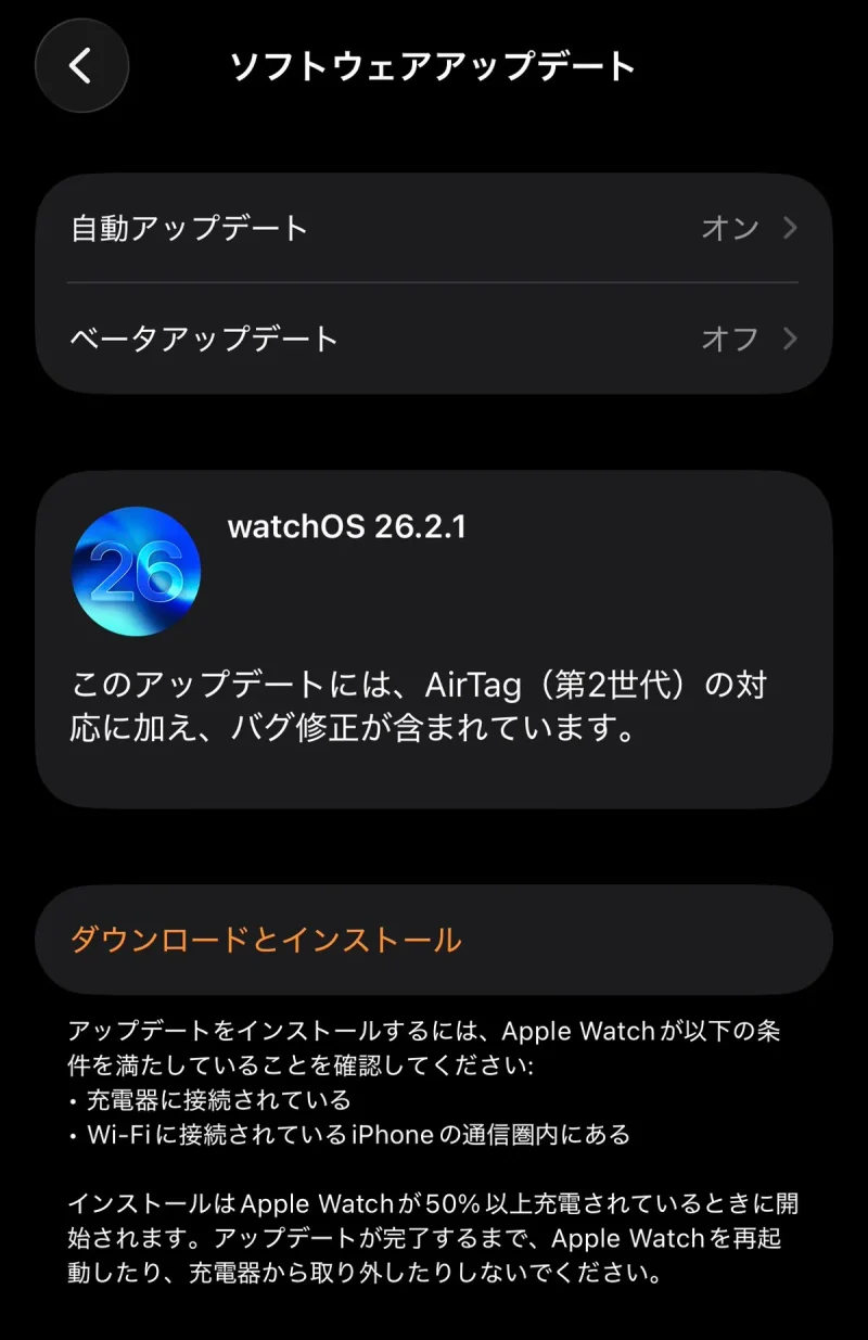 watchOS 26.2.1では、26日に発表されたばかりの「AirTag(第2世代)」をサポートするほか、バグ修正が実施されている。本アップデートを適用したApple Watch Series 9以降、またはApple Watch Ultra 2以降では、「正確な場所を見つける」機能を使ってAirTagを探せるようになる。