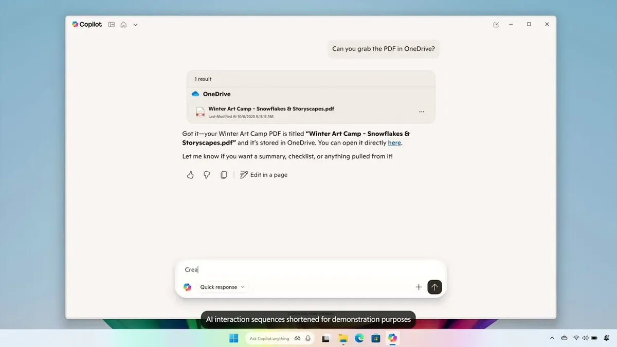 新しい「Ask Copilot on the taskbar」を通じて、ファイルやアプリ検索をよりスムーズに行えるほか、「Copilot Actions」ではブラウザを超えてローカルファイルへの操作も可能になった。たとえば、写真整理やPDF抽出などの作業を、ユーザーが他のタスクを進めている間に実行できる。